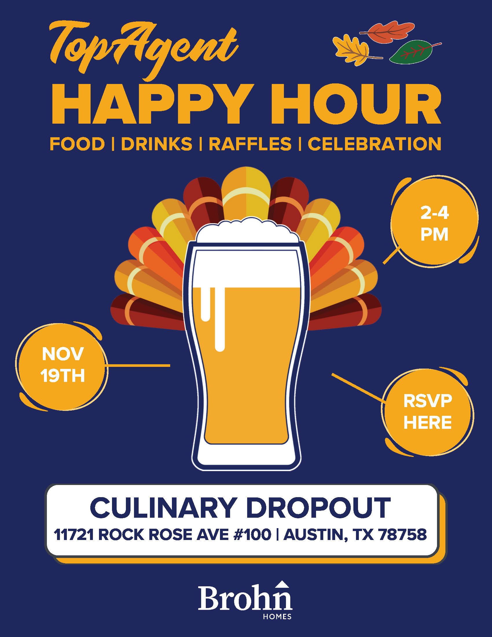 Calling all TopAgents – 2025 is wrapping up, let’s celebrate together at Culinary Dropout with a happy hour! Enjoy food, drinks, and raffle prizes while networking with our superb sales team, financial partners, and fellow Realtors. Whether you’ve sold one home with us this year, or 17 (yes, someone has sold 17 homes with us this year), or you’re new to Brohn, come spend some time with us and learn about our amazing incentives for you and your buyers.