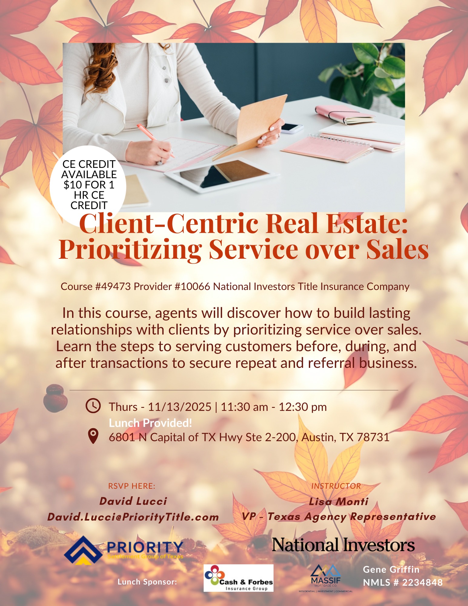 Join us for โClient-Centric Real Estate: Prioritizing Service Over Salesโ โ a course designed to help agents strengthen client relationships and grow their business through service-focused strategies.